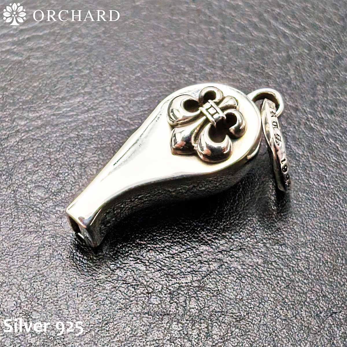 シルバー925製の百合(フルール・ド・リス)モチーフホイッスルペンダントです。側面に立体的な百合紋章が施され、クラシックかつ気品のあるデザインが特徴。小ぶりで軽量(約5g)のため、さりげなく首元に輝きを与えます。シルバーの上質な輝きが魅力的で、カジュアルからフォーマルまで幅広いスタイルに対応可能。ユニセックスでご利用いただけるアイテムです。