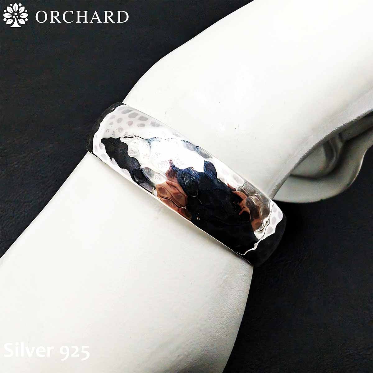 シルバー925製の槌目模様バングルです。職人の手仕事を感じさせる叩き出し模様が表面に施されており、シンプルながらも個性的な風合いを楽しめます。軽量で着け心地が良く、スリット入りのため手首サイズに合わせて調整可能。カジュアルからフォーマルまで幅広く活躍し、ユニセックスでお使いいただけます。
