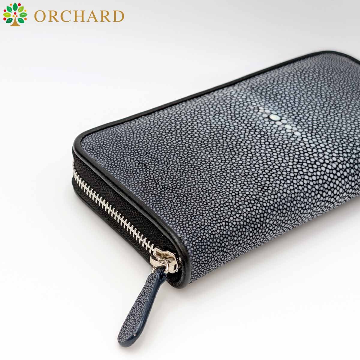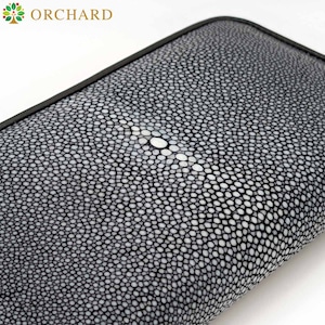 スティングレイ(ガルーシャ)を使用した長財布です。ラウンドファスナー付きで、ネイビーの色合いが落ち着いた印象を演出し、スティングレイの独特な質感が高級感を際立たせます。収納力があり、カード、お札、コインを整理しやすく、実用性に優れたデザインです。日常使いから特別なシーンまで幅広くご利用いただけます。